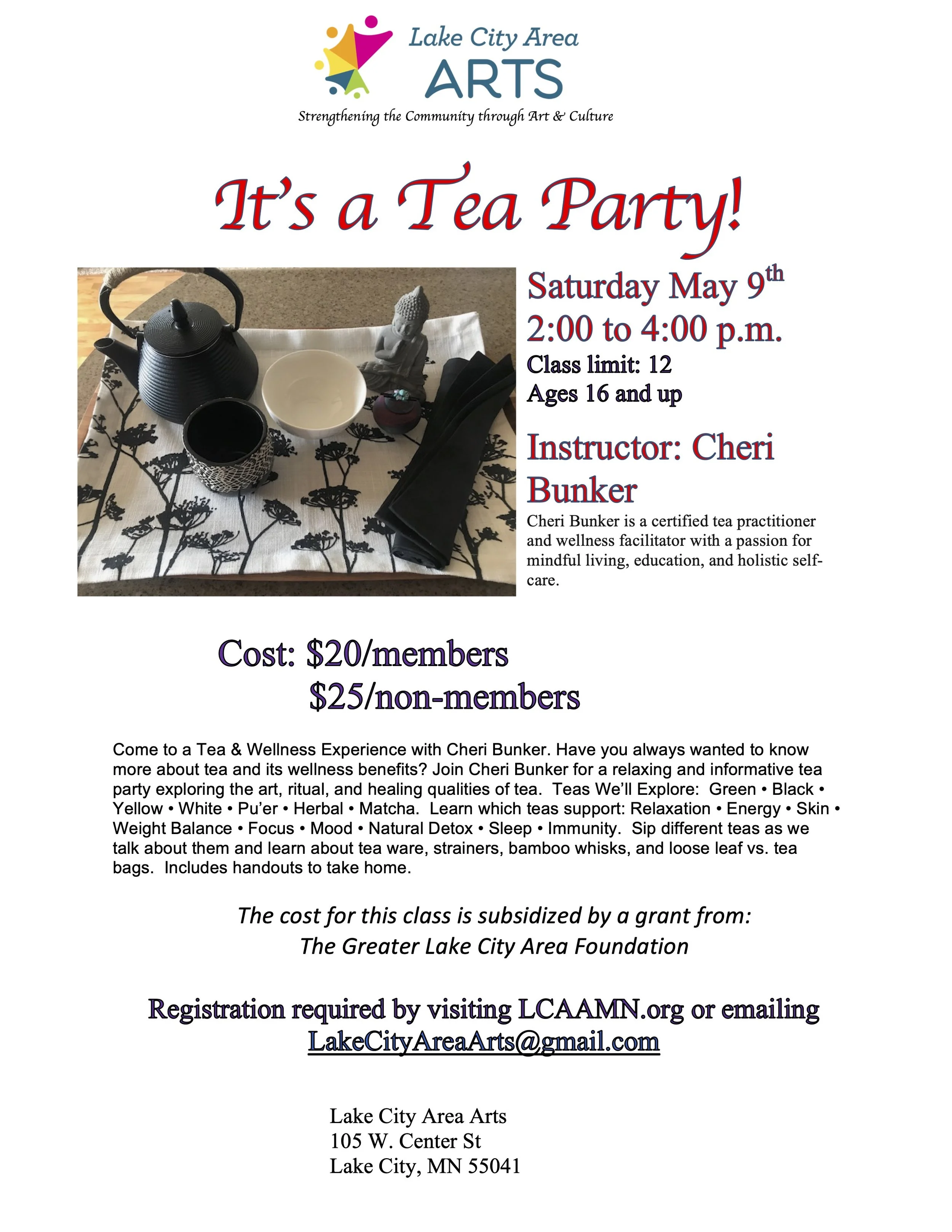 May 9th: It’s a Tea Party! Instructor: Cheri Bunker*. 2:00 - 4:00 p.m. $20 members, $25 for non-members. Come to a Tea & Wellness Experience with Cheri Bunker. Have you always wanted to know more about tea and its wellness benefits? Join Cheri Bunker for a relaxing and informative tea party exploring the art, ritual, and healing qualities of tea. Teas We’ll Explore: Green • Black • Yellow • White • Pu’er • Herbal • Matcha. Learn which teas support: Relaxation • Energy • Skin • Weight Balance • Focus • Mood • Natural Detox • Sleep • Immunity. Sip different teas as we talk about them and learn about tea ware, strainers, bamboo whisks, and loose leaf vs. tea bags. Includes handouts to take home. *Cheri Bunker is a certified tea practitioner and wellness facilitator with a passion for mindful living, education, and holistic self-care.