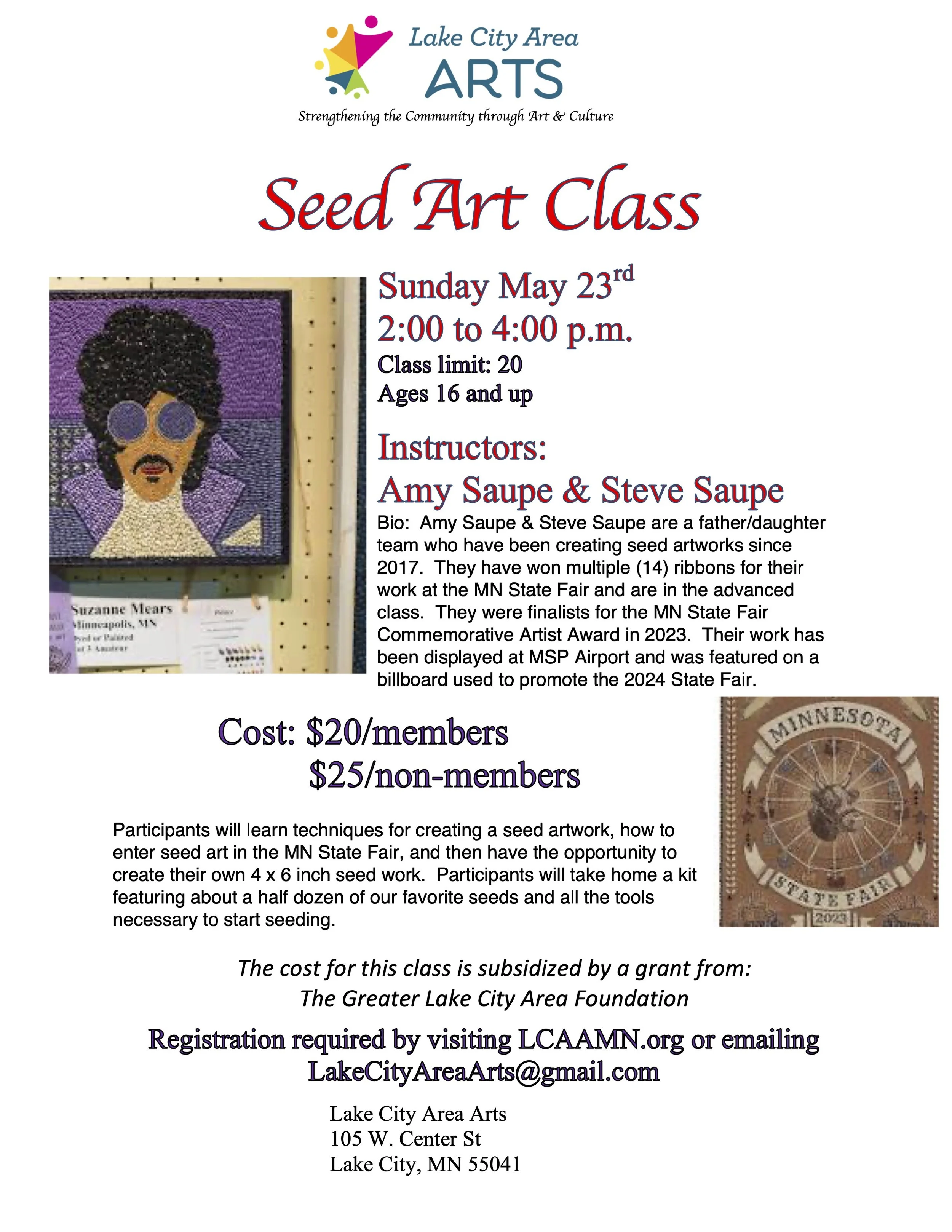 Seed Art - instructors: father daughter team, Amy Saupe and Steve Saupe. Saturday, May 23rd from 2:00 - 5:00 p.m. Cost: $35 for LCAA members, $40 for non-members. Participants will learn techniques for creating a seed artwork, how to enter seed art in the MN State Fair, and then have the opportunity to create their own 4 x 6 inch seed work. Participants will take home a kit featuring about a half dozen of our favorite seeds and all the tools necessary to start seeding. Amy and Steve have been creating seed artworks since 2017. They have won multiple (14) ribbons for their work at the MN State Fair and are in the advanced class. They were finalists for the MN State Fair Commemorative Artist Award in 2023. Their work has been displayed at MSP Airport and was featured on a billboard used to promote the 2024 State Fair. More info to come. Class size is limited to 20. Preregistration is recommended, but walk-ins will be accepted if space is available.