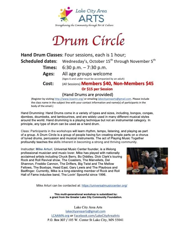 October 15th (Wednesdays) to Nov 5th - 6:30 - 7:30 pm. Drum Circle. Taught by musician, Mike Arturi. 4 Wednesday sessions starting October 15th and running through November 5th. Cost: $40 for members or $45 for nonmembers payable at the first session. Otherwise, $15 per session. We thank the Greater Lake City Foundation for a grant which allows the LCAA to subsidize the cost of this class. More info to come.