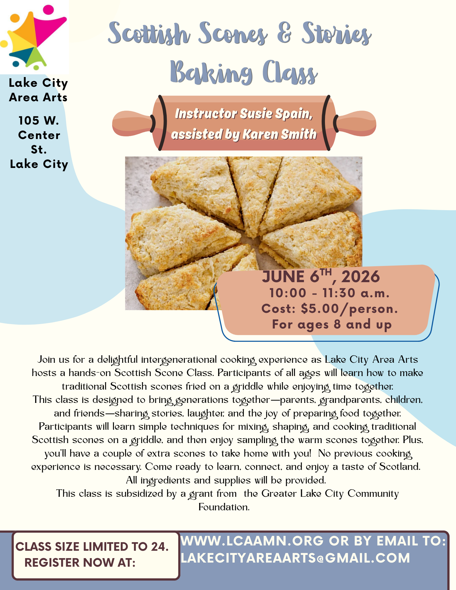Join us for a delightful intergenerational cooking experience as Lake City Area Arts hosts a hands-on Scottish Scone Class. Participants of all ages will learn how to make traditional Scottish scones fried on a griddle while enjoying time together.