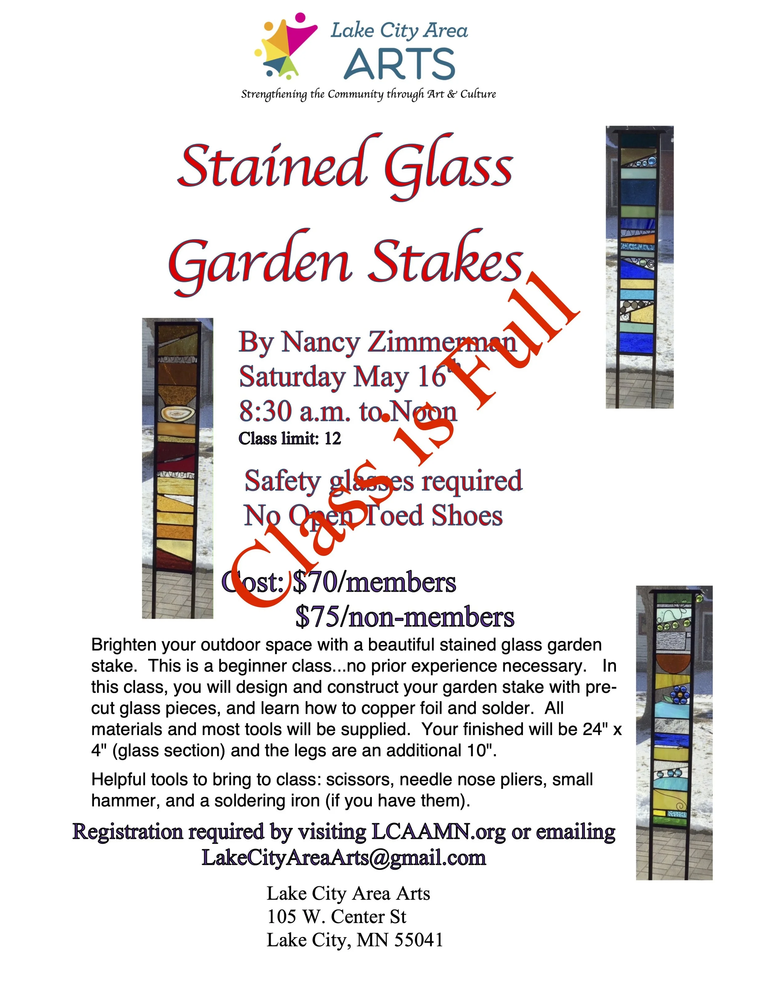 Stained Glass Garden Stake Class - Instructor Nancy Zimmermann. Wednesday, May 27th, 5:30 - 9:00 pm. Cost: $70 for LCAA members, $75 for non-members. Brighten your outdoor space with a beautiful stoned glass garden stake. This is a beginner class…no prior experience necessary. There will be no glass cutting required for this class but you will do foil wrapping as well as soldering. Check out the LCAA corner window for an example of the finished product! Pre-registering required.