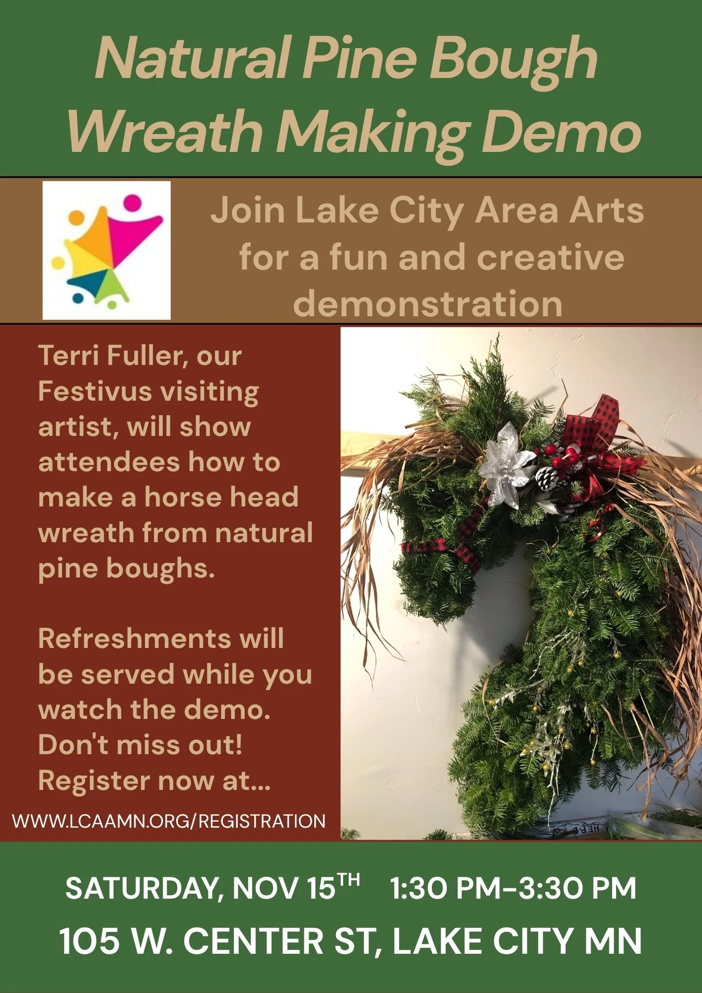 Nov 16th-Dec 13th Festival of Wreaths. The Festival of Wreaths kicks off LCAA’s Holiday events! In addition to a wonderful artist - our Gallery will be filled with beautifully decorated wreaths donated and designed by local organizations. You can purchase or bid on any of these wreaths and they come with gifts like free rounds of Golf, Local area Gift Certificates and weekend Getaways! We are open 10-2 on Fridays and Saturdays from Nov 16th to Dec 13th. Don’t miss this festive event!