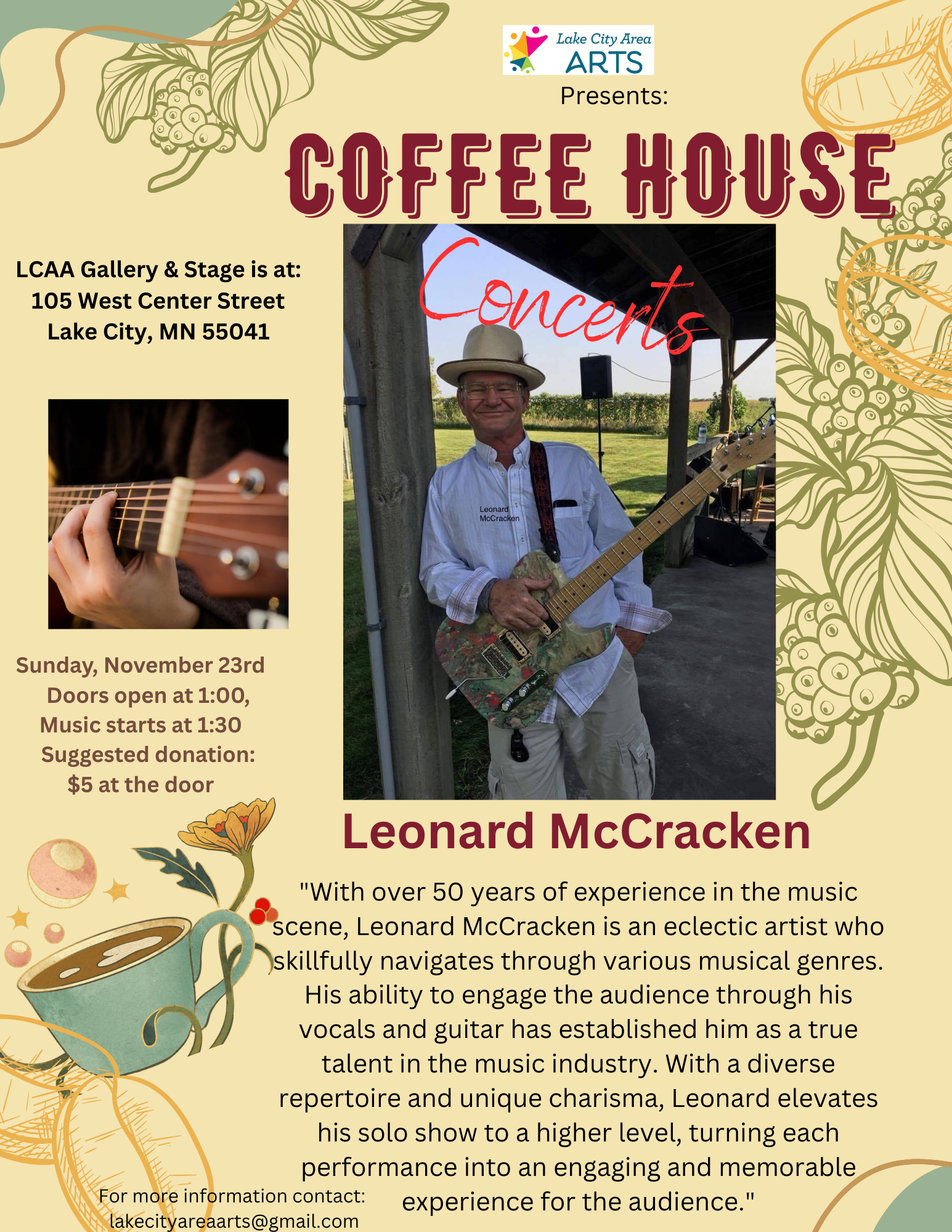 November 23rd (Sunday) - 1:30 pm. Live music at the LCAA - Len McCracken. See related poster.
